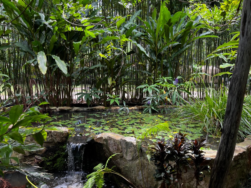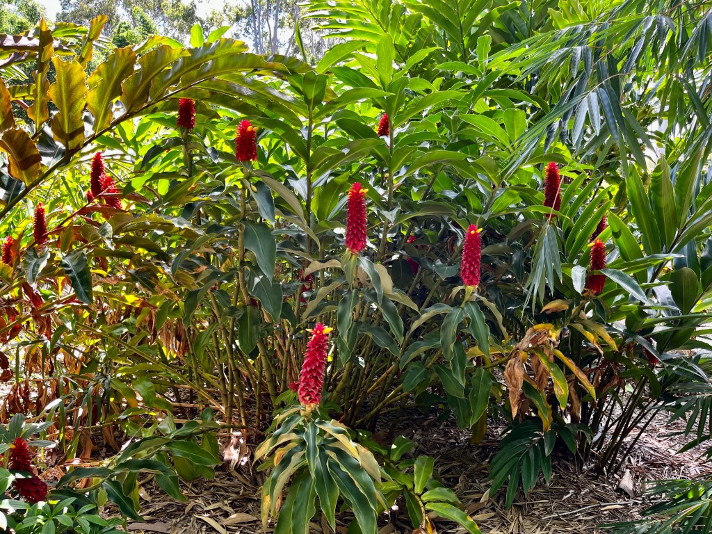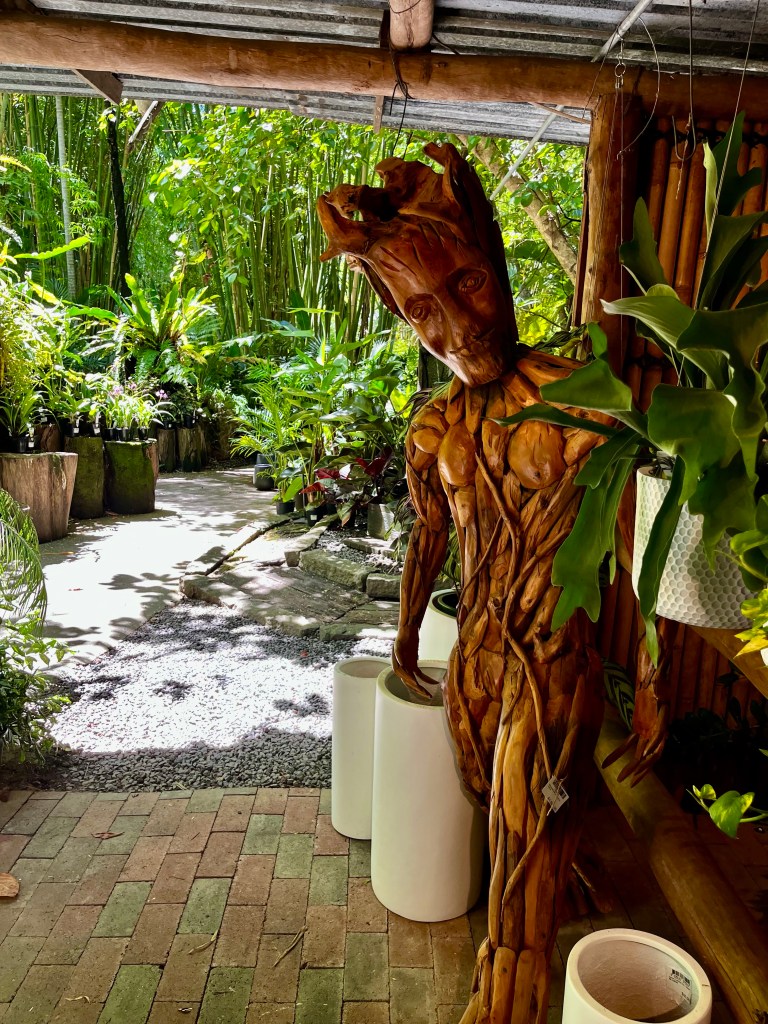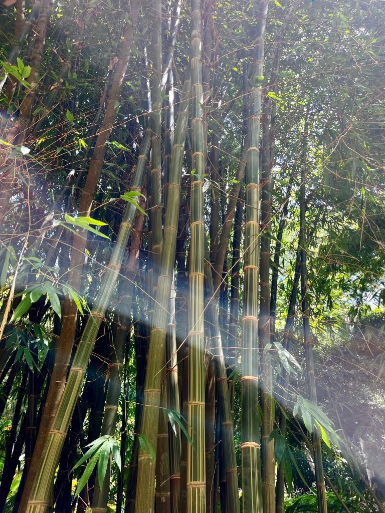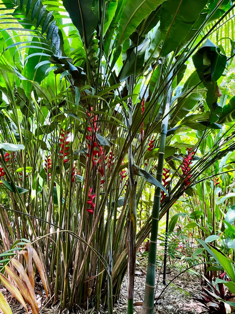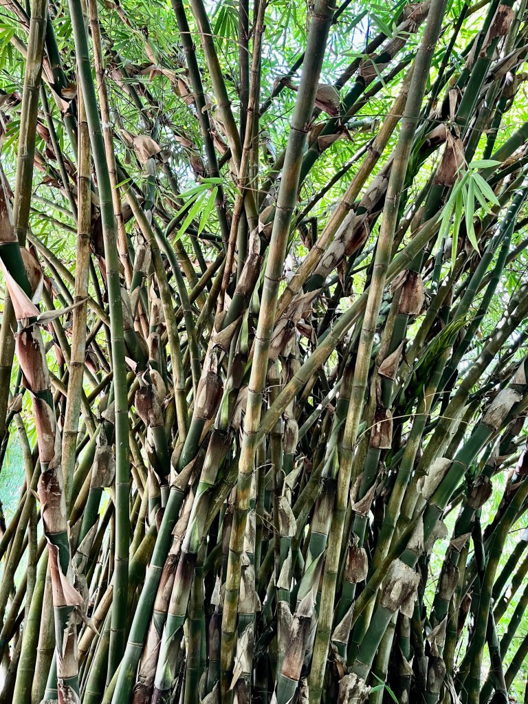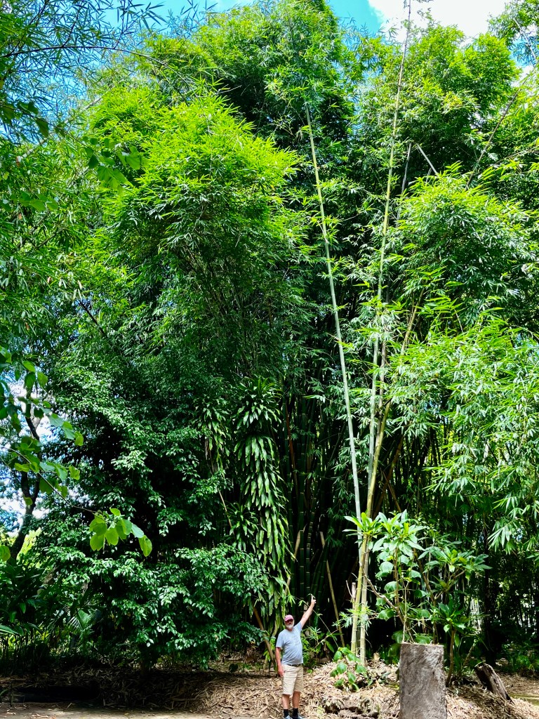 After driving a while Dirk saw signs along road offering a Coffee and banana bread deal at Bamboo Land (!) so we took a short detour. What a surprise! We were happy we stopped as it was a botanic garden of bamboo with many many kinds of towering bamboo plus birds of paradice bushes and various palms. Also wood “sculptures”. Great stop!