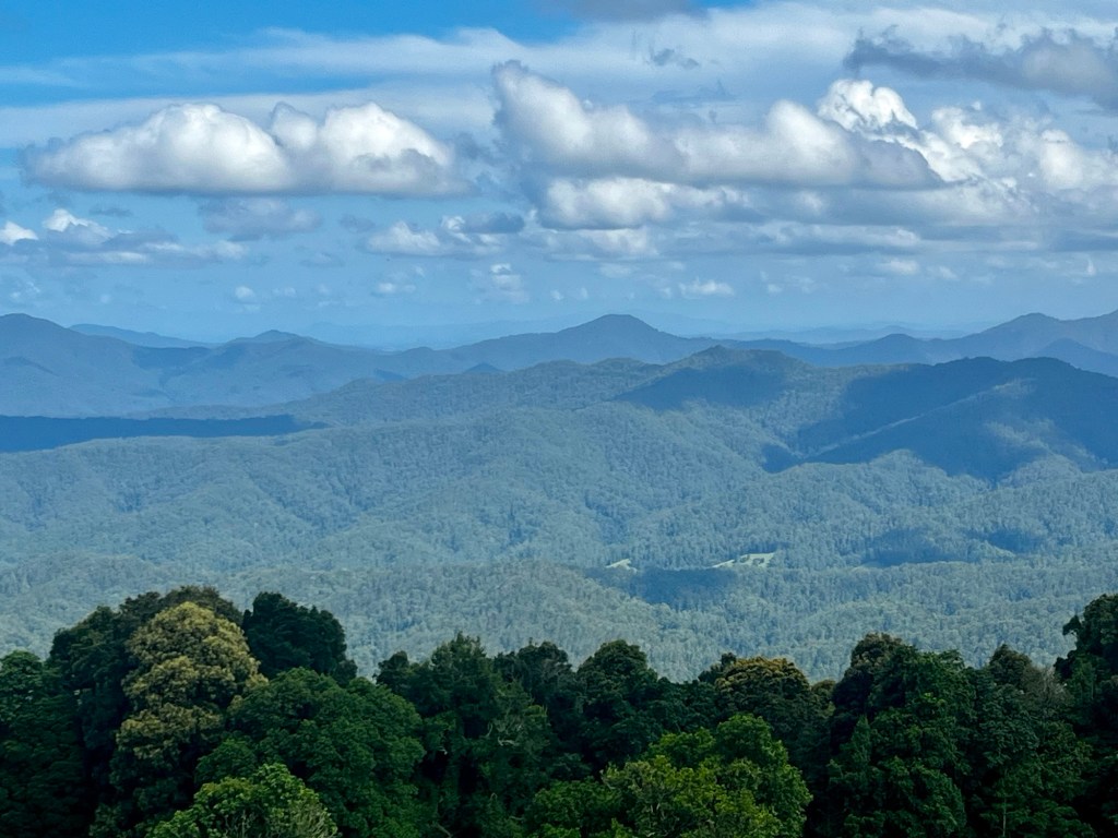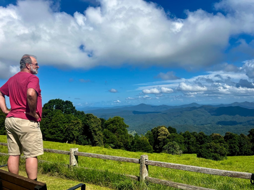 Then off to Dorringo National Park to walk in rain forest and visit the Crystal Shower Falls. Turns out it was up one of those scary, snake turns roads and I was driving! When I pulled over to let some cars pass Dirk saw a mountain lookout sign and we headed there-the Griffith lookout of the Great Divide Mountains between the ocean and inland. Wow!!