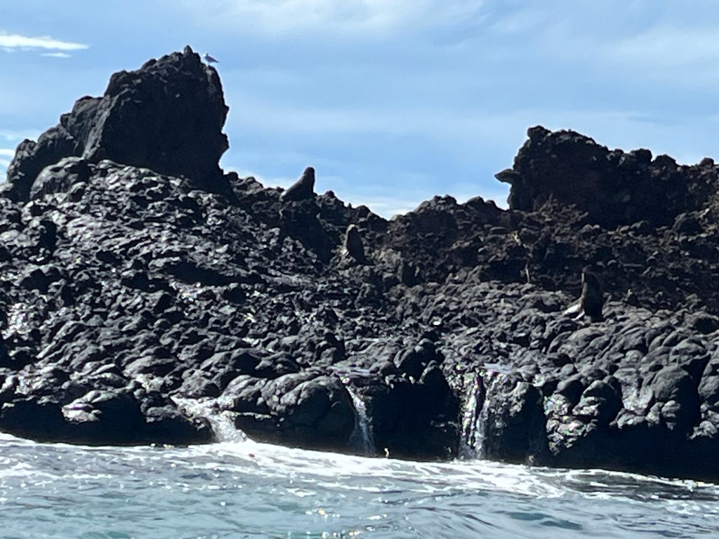 I had booked an excursion separate from Holland America and it turned out to be a very good way to see unusual birds and ‘ducks’ and even little penguins as well as some seals and a sea lion. The tour included excellent binoculars so we actually see the small floating birds from a distance. However we didn’t get any bird photos, but see if you can find the seals among the old lava rocks.