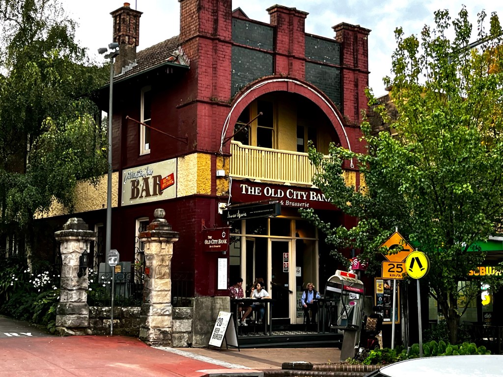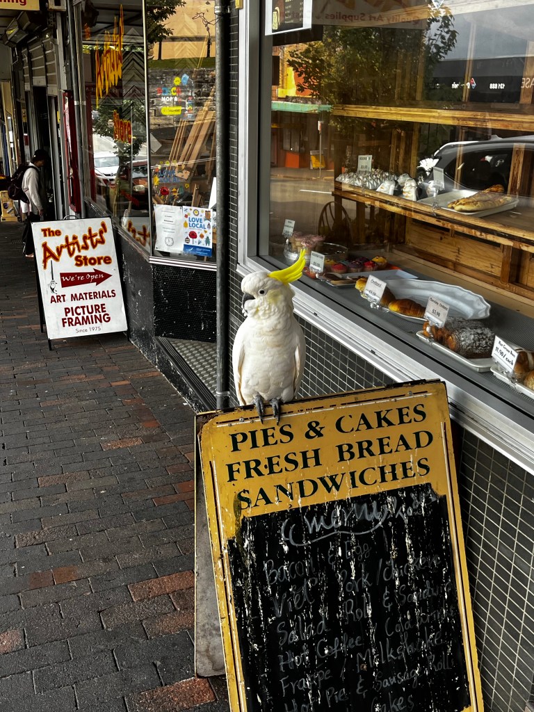 We left the cliffs and after a while the bus took us to the small and pretty town of Leura where we ate lunch. Then another bus ride and back to Katoomba and a walk to our hotel. On the way we stopped at the elegant Carrington Hotel and later laughed at the comfortable cockatoo just sitting on the sign as we went by.